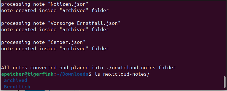 Am Ende liegt in einem neu erstelltem Ordner “nextcloud-notes” das Ergebnis der Migration. Dieser Inhalt will jetzt nur noch auf die Nextcloud Instanz hochgeladen werden, in den Ordner “Notizen”. Am einfachsten funktioniert dies, wenn man den ganzen Inhalt markiert und per Drag-and-drop in Nextcloud im Browser zieht.